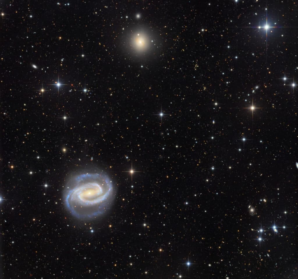 Die beiden Hauptobjekte sind die NGC 5101 (oben rechts) und NGC 5058. Bei beiden handelt es sich um Milchstraßen, ähnlich der „unseren“, in der wir leben. Ihr Licht, welches Eric über einen Zeitraum von knapp 30 Stunden in seiner Sternwarte in Australien gesammelt hat, stammt aus einer Zeit, als sich auf Erden gerade das Mittelmeer gebildet hat, und als es noch keine Alpen gab. Also etwa vor 100 Mio. Jahren.
